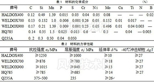 HALDOX400、WELDOX700、WELDOX900是瑞典SSAB公司生產(chǎn)的 Oxelosund 牌低合金高強(qiáng)度合金鋼,HQ785由鞍山鋼鐵公司生產(chǎn),其化學(xué)成分見(jiàn)表1,力學(xué)性能見(jiàn)表2[1-2]。