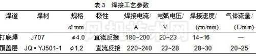 為了保證高強(qiáng)度材料的安全使用,充分發(fā)揮這類材料的高硬度、高強(qiáng)度、高韌性等優(yōu)良性能,在焊接之前必須采取預(yù)熱措施,焊后保溫緩冷,并進(jìn)行必要的焊接消應(yīng)力處理。根據(jù)此類材料的化學(xué)成分和機(jī)械性能特點(diǎn),選擇強(qiáng)度等級(jí)低于母材而沖擊韌性高于母材的焊接材料[4] ,實(shí)現(xiàn)焊縫組織具有韌性大、延伸性好、產(chǎn)生裂紋傾向性小等特點(diǎn)的目的。首先將試板采取對(duì)接平焊,坡口為Y型,采用J707堿性焊條電弧焊打底,再用JQ·YJ501-1藥芯焊絲CO2 保護(hù)焊,進(jìn)行多層多道焊覆蓋。焊接工藝參數(shù)見(jiàn)表3,焊接時(shí)采用小電流焊接并控制焊接層間溫度不超過(guò)200℃。