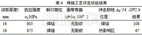 (2) 這類高強(qiáng)度合金鋼材料在焊接時(shí),可選用強(qiáng)度等級(jí)低于母材而沖擊韌性高于母材的堿性焊條如J707進(jìn)行電弧焊打底,再用JQ·YJ501-1藥芯焊絲CO2保護(hù)焊,進(jìn)行多層多道焊覆蓋,其焊縫的力學(xué)性能能滿足設(shè)計(jì)要求。