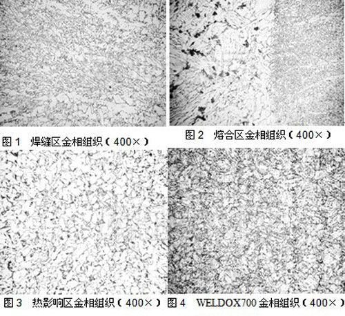 對(duì)焊接試板進(jìn)行打磨拋光再用4%硝酸酒精腐蝕,其金相組織分析表明:在焊縫區(qū)組織為塊狀先共析鐵素體+粒狀貝氏體+少量珠光體,晶粒較細(xì),具有良好的韌性和延伸性(見(jiàn)圖1);熔合區(qū)熔合線明顯,左側(cè)為母材熱影響區(qū),右側(cè)為焊縫柱狀晶,化學(xué)成分及組織存在不均勻性,局部晶界有少量黑色淬火屈氏體存在,有引發(fā)裂紋的傾向(見(jiàn)圖2);在熱影響區(qū)組織為塊狀鐵素體+團(tuán)狀珠光體(見(jiàn)圖3);母材基體為回火索氏體,組織均勻(見(jiàn)圖4)。
