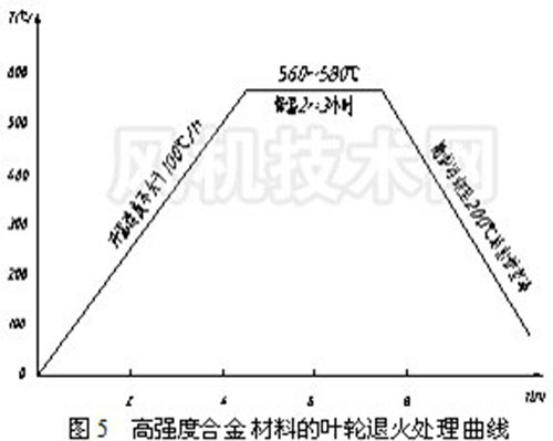 而WELDOX及HQ785材料可采用退火 去應(yīng)力處理,其工藝見(jiàn)圖5。葉輪出爐空冷后,強(qiáng)度幾乎不降,有時(shí)還略有上升,原因是工件在退火前存在于組織中的部分不穩(wěn)定相如 淬火屈氏體等在退火過(guò)程中得以轉(zhuǎn)化為穩(wěn)定相。