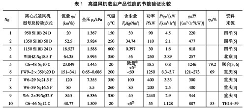 (3)北京風(fēng)機(jī)二廠生產(chǎn)的用于水泥窯尾高溫風(fēng)機(jī)單、雙吸4個(gè)系列,其中WDHZ型系列單吸高溫(載塵)風(fēng)機(jī)[3],其性能節(jié)能驗(yàn)證比較見表1。